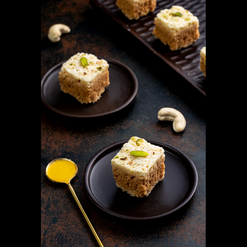 Sugar, Deshi Ghee, Cashew, Fine Flour, Pistachio & Cardamom